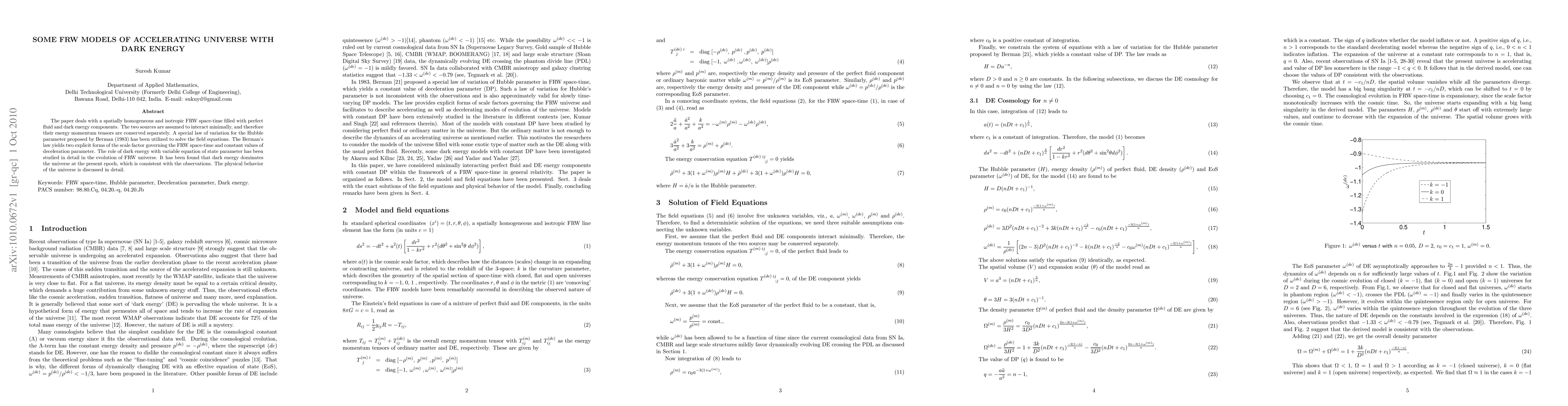 The paper deals with a spatially homogeneous and isotropic FRW space-time filled with perfect fluid and dark energy components. The two sources are assumed to interact minimally, and therefore their energy momentum tensors are conserved separately. A special law of variation for the Hubble parameter proposed by Berman (1983) has been utilized to solve the field equations. The Berman's law yields two explicit forms of the scale factor governing the FRW space-time and constant values of deceleration parameter. The role of dark energy with variable equation of state parameter has been studied in detail in the evolution of FRW universe. It has been found that dark energy dominates the universe at the present epoch, which is consistent with the observations. The physical behavior of the universe is discussed in detail.