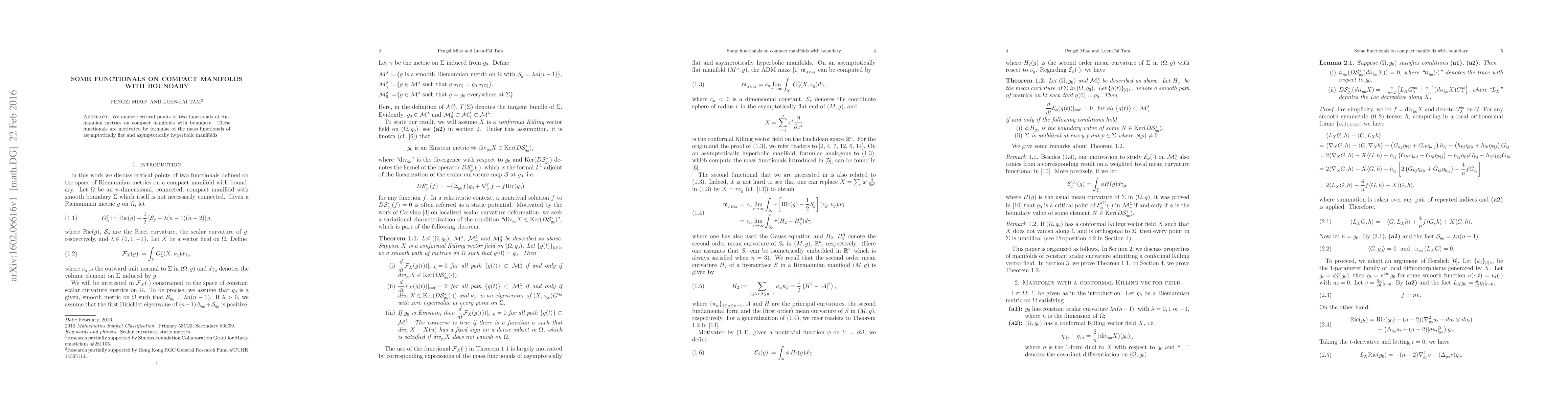 Researchers analyze critical points of functionals on compact manifolds with boundary, inspired by mass functionals of asymptotically flat and hyperbolic manifolds, shedding light on their behavior and implications for understanding these geometric spaces.
