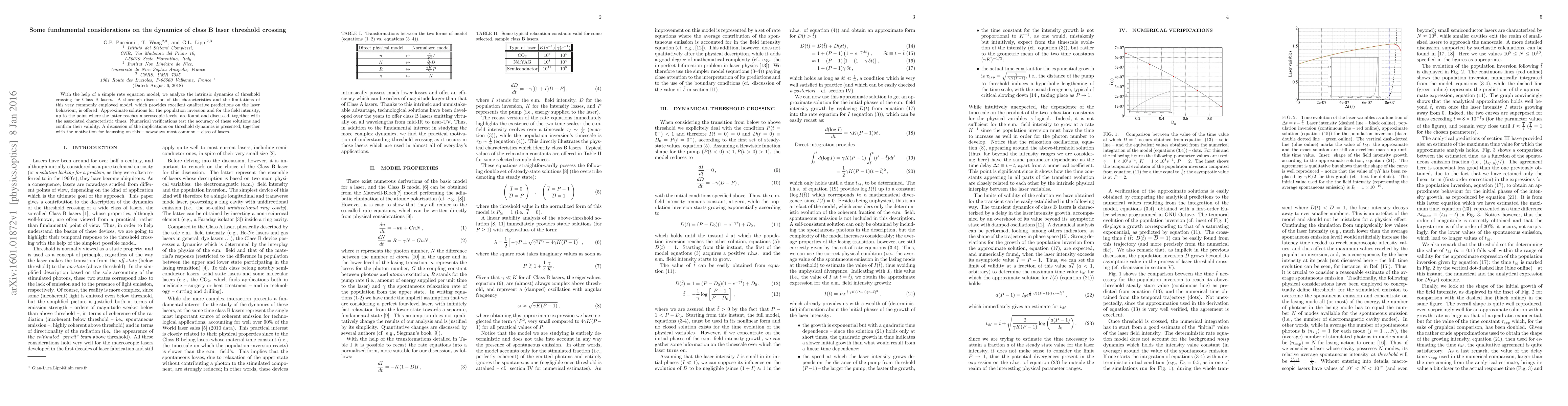 With the help of a simple rate equation model, we analyze the intrinsic dynamics of threshold crossing for Class B lasers. A thorough discussion of the characteristics and the limitations of this very commonly employed model, which provides excellent qualitative predictions on the laser behaviour, is offered. Approximate solutions for the population inversion and for the field intensity, up to the point where the latter reaches macroscopic levels, are found and discussed, together with the associated characteristic times. Numerical verifications test the accuracy of these solutions and confirm their validity. A discussion of the implications on threshold dynamics is presented, together with the motivation for focussing on this -- nowadays most common -- class of lasers.