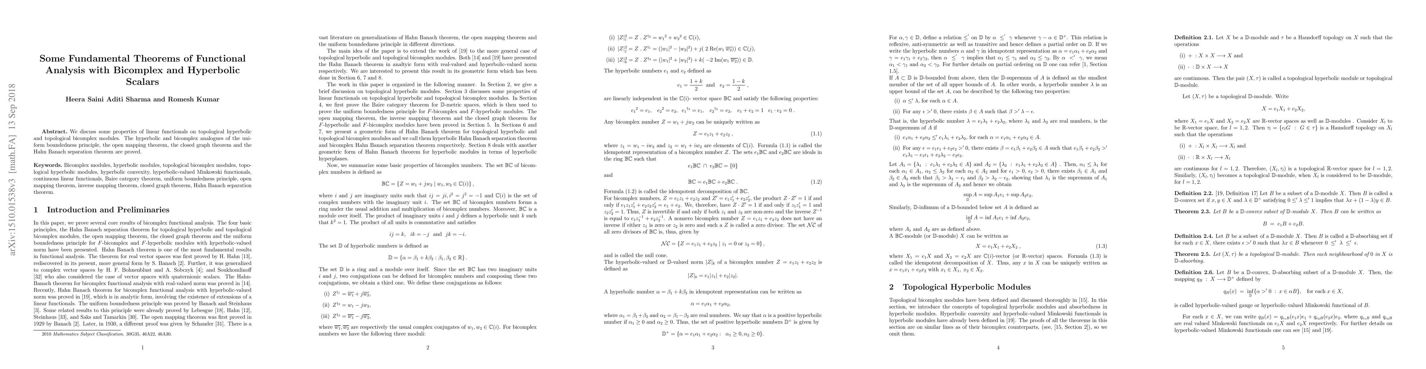 The paper presents rigorous proofs and extensions of fundamental theorems in functional analysis to bicomplex and hyperbolic scalars, advancing the theoretical framework in this area.