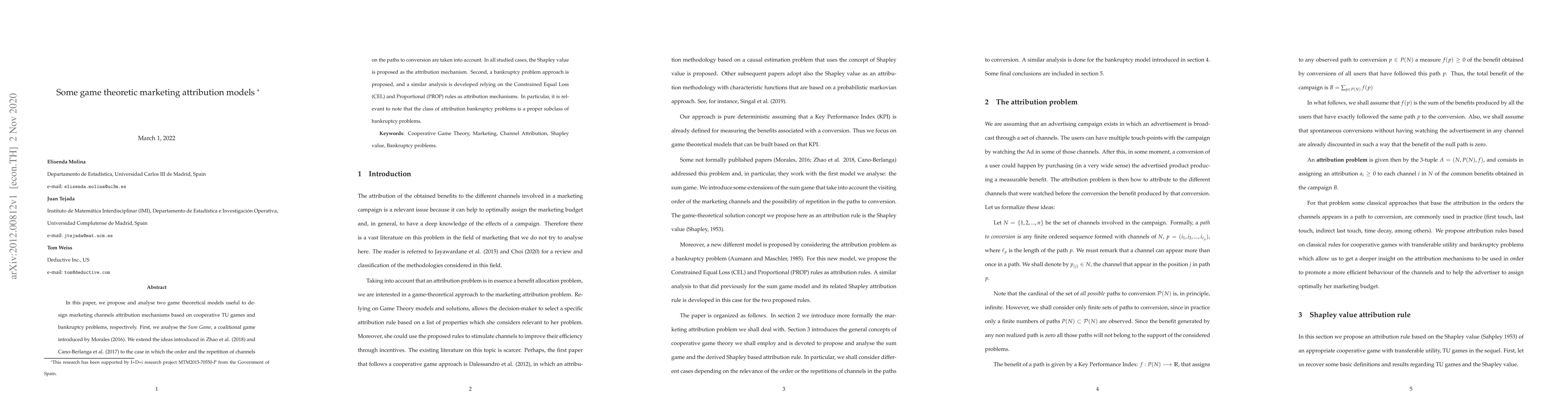 This paper proposes two game theoretical models for marketing channel attribution: one based on cooperative TU games and the Sum Game, using the Shapley value for attribution, and another based on bankruptcy problems with Constrained Equal Loss and Proportional rules. Both models consider the order and repetition of channels in conversion paths.