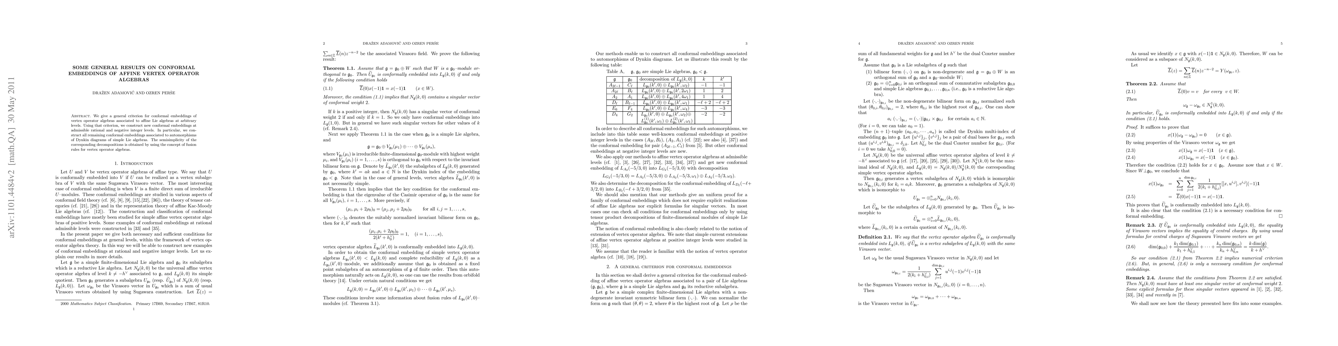 We give a general criterion for conformal embeddings of vertex operator algebras associated to affine Lie algebras at arbitrary levels. Using that criterion, we construct new conformal embeddings at admissible rational and negative integer levels. In particular, we construct all remaining conformal embeddings associated to automorphisms of Dynkin diagrams of simple Lie algebras. The semisimplicity of the corresponding decompositions is obtained by using the concept of fusion rules for vertex operator algebras.