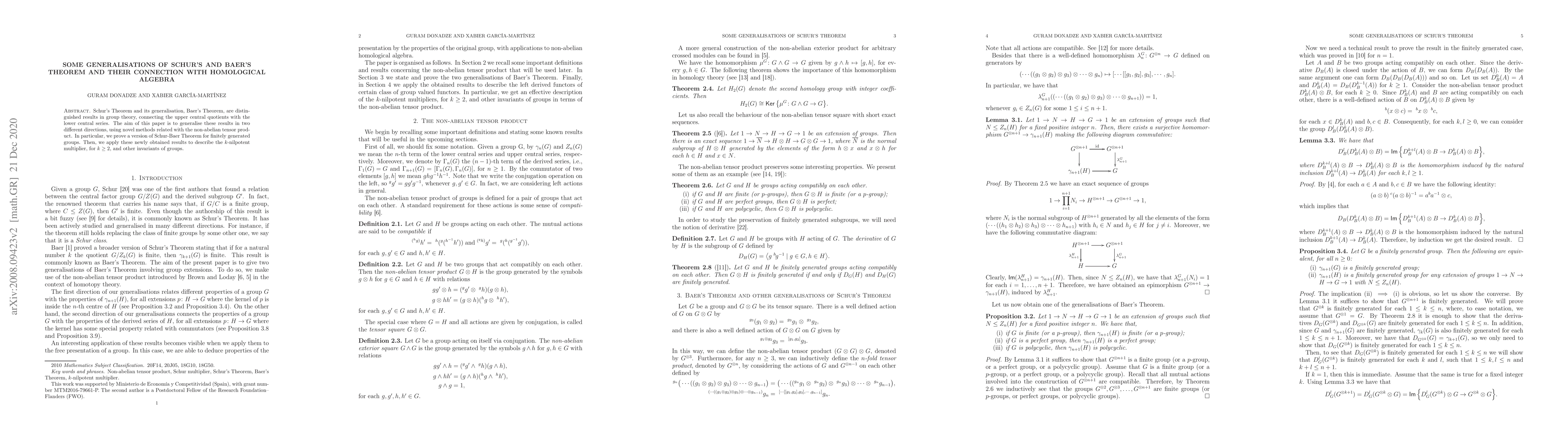 This paper generalises Schur's and Baer's theorems using non-abelian tensor product methods, proving a Schur-Baer Theorem for finitely generated groups and applying these results to describe higher-order nilpotent multipliers and group invariants.