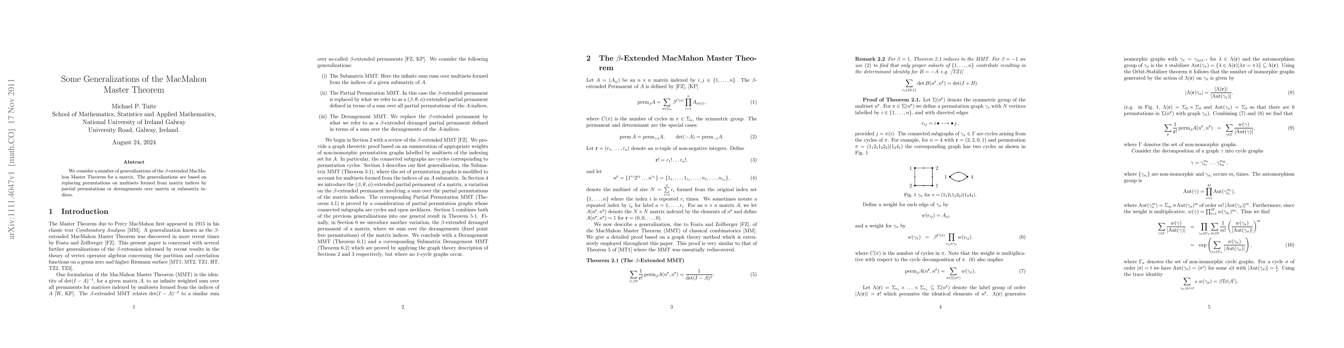 This paper explores various generalizations of the $\beta$-extended MacMahon Master Theorem for matrices, focusing on replacing permutations on multisets with partial permutations or derangements over matrix or submatrix indices.