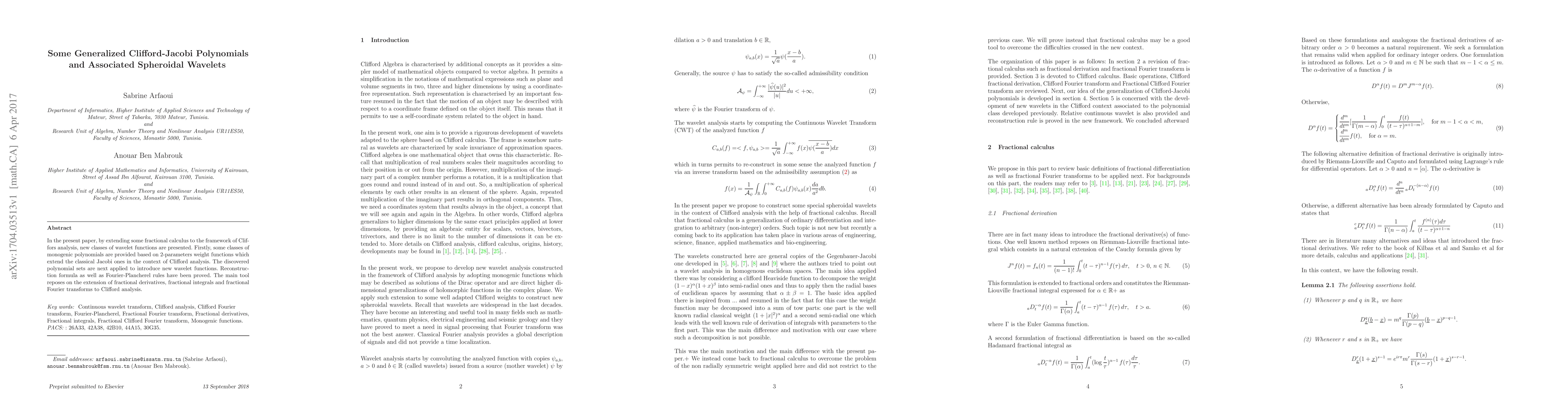 In the present paper, by extending some fractional calculus to the framework of Cliffors analysis, new classes of wavelet functions are presented. Firstly, some classes of monogenic polynomials are provided based on 2-parameters weight functions which extend the classical Jacobi ones in the context of Clifford analysis. The discovered polynomial sets are next applied to introduce new wavelet functions. Reconstruction formula as well as Fourier-Plancherel rules have been proved. The main tool reposes on the extension of fractional derivatives, fractional integrals and fractional Fourier transforms to Clifford analysis.