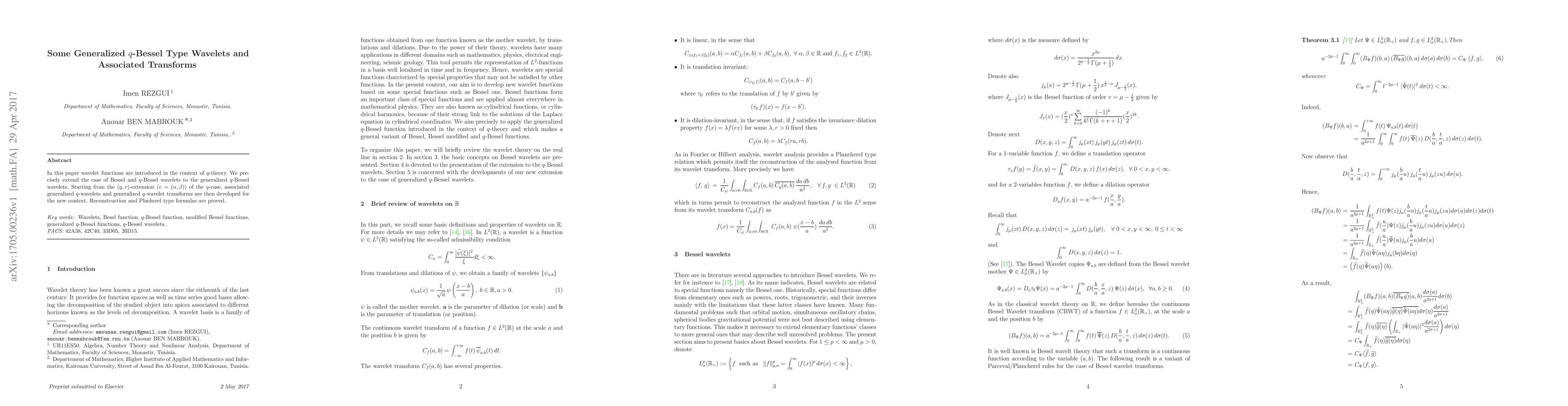 In this paper wavelet functions are introduced in the context of $q$-theory. We precisely extend the case of Bessel and $q$-Bessel wavelets to the generalized $q$-Bessel wavelets. Starting from the $(q,v)$-extension ($v=(\alpha,\beta)$) of the $q$-case, associated generalized $q$-wavelets and generalized $q$-wavelet transforms are then developed for the new context. Reconstruction and Plancherel type formulas are proved.