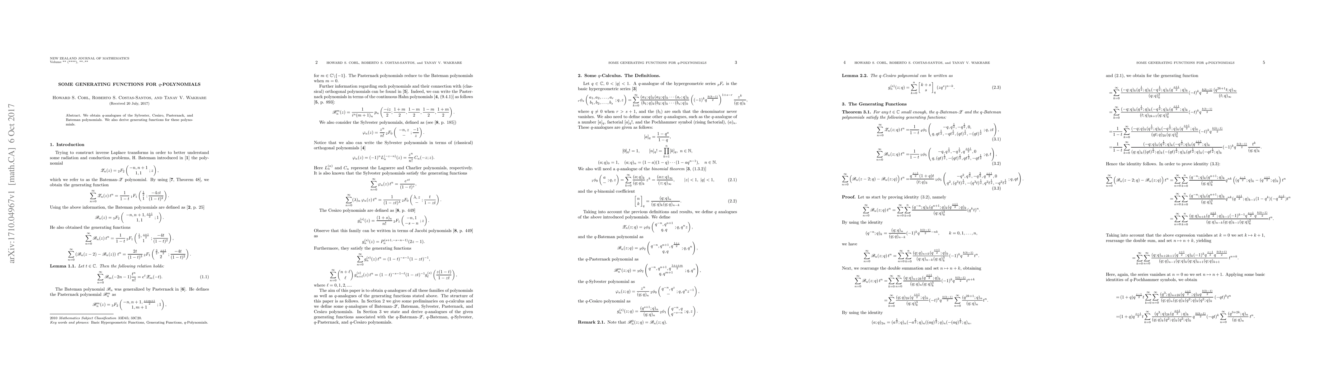 The paper presents q-analogues of classical polynomials including Sylvester, Cesàro, Pasternack, and Bateman polynomials, along with their respective generating functions. These results extend classical polynomial theory into the q-domain.
