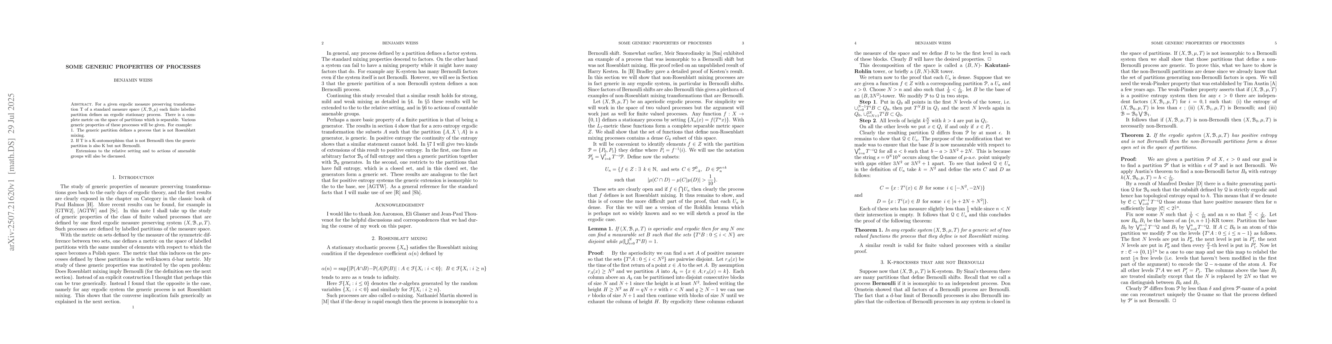 For a given ergodic measure preserving transformation T of a standard measure space each finite labelled partition defines an ergodic stationary process. There is a complete metric on the space of partitions which is separable. Various generic properties of these processes will be given. For example: 1. The generic partition defines a process that is not Rosenblatt mixing. 2. If T is a K-automorphism that is not Bernoulli then the generic partition is also K but not Bernoulli. Extensions to the relative setting and to actions of amenable groups will also be discussed.