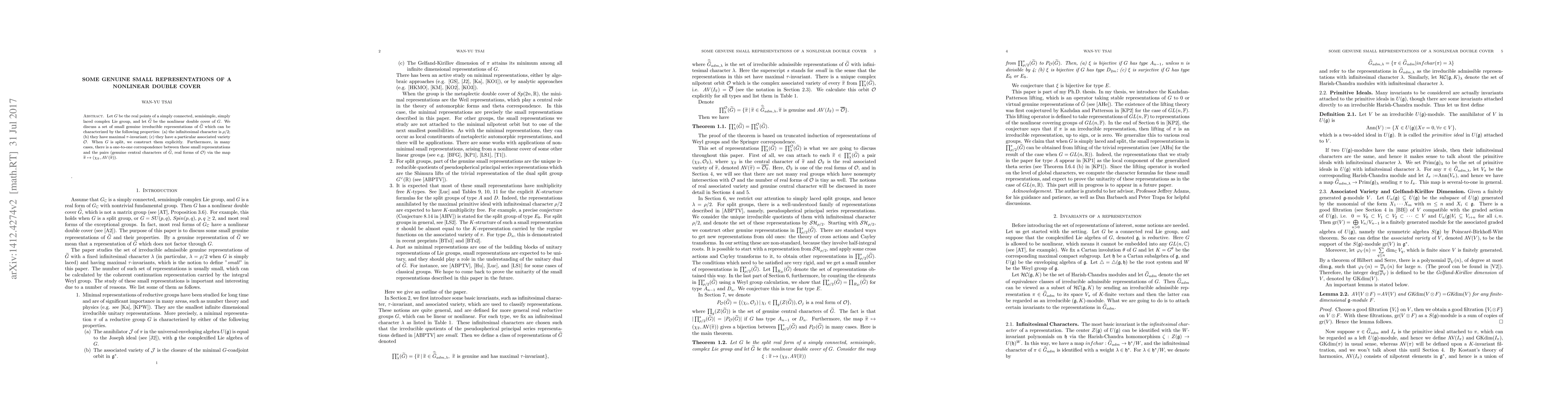 Let G be the real points of a simply connected, semisimple, simply laced complex Lie group, and let \tilde{G} be the nonlinear double cover of G. We discuss a set of small genuine irreducible representations of \tilde{G} which can be characterized by the following properties: (a) the infinitesimal character is \rho/2; (b) they have maximal tau-invariant; (c) they have a particular associated variety O. When G is split, we construct them explicitly. Furthermore, in many cases, there is a one-to-one correspondence between these small representations and the pairs (genuine central characters of \tilde{G}, real forms of O) via the map \pi mapped to (central character of \pi, real associated variety of \pi).