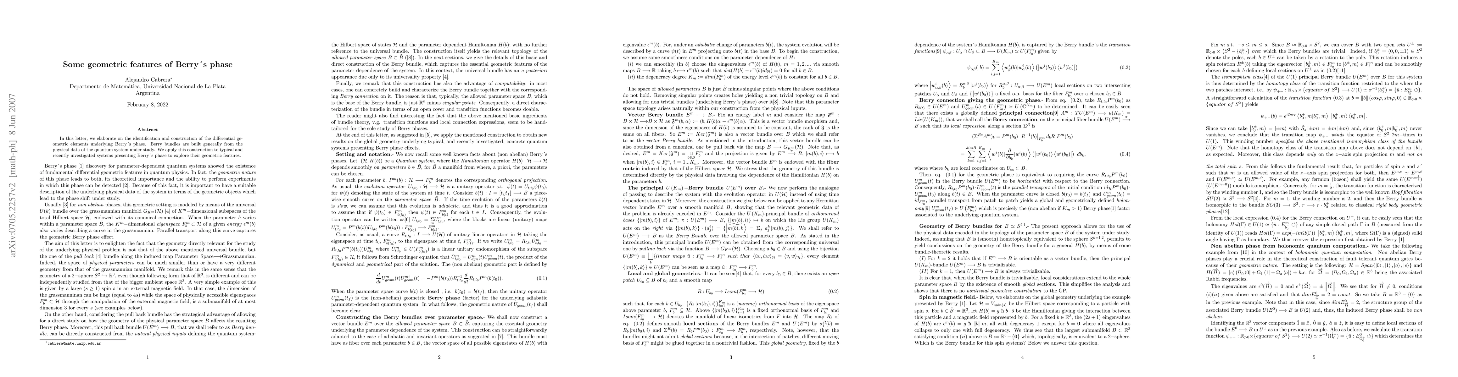 In this letter, we elaborate on the identification and construction of the differential geometric elements underlying Berry's phase. Berry bundles are built generally from the physical data of the quantum system under study. We apply this construction to typical and recently investigated systems presenting Berry's phase to explore their geometric features.