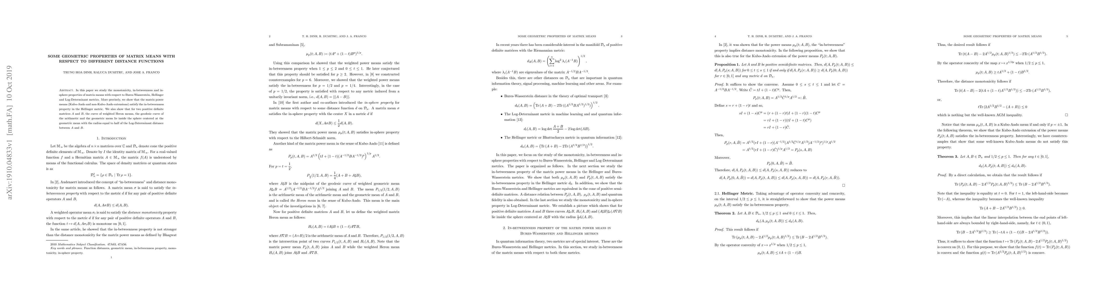 This paper investigates geometric properties of matrix means under various metrics, demonstrating that matrix power means satisfy in-betweenness in the Hellinger metric. It also shows that weighted Heron means and geodesic curves of the arithmetic and geometric mean lie within a sphere defined by the Log-Determinant distance for positive definite matrices.