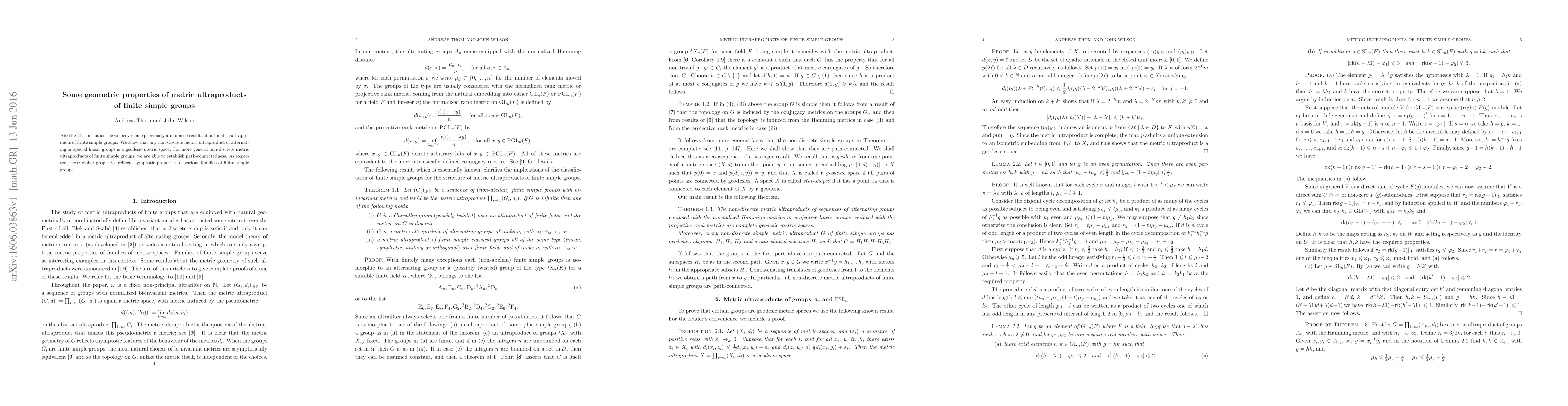 In this article we prove some previously announced results about metric ultraproducts of finite simple groups. We show that any non-discrete metric ultraproduct of alternating or special linear groups is a geodesic metric space. For more general non-discrete metric ultraproducts of finite simple groups, we are able to establish path-connectedness. As expected, these global properties reflect asymptotic properties of various families of finite simple groups.