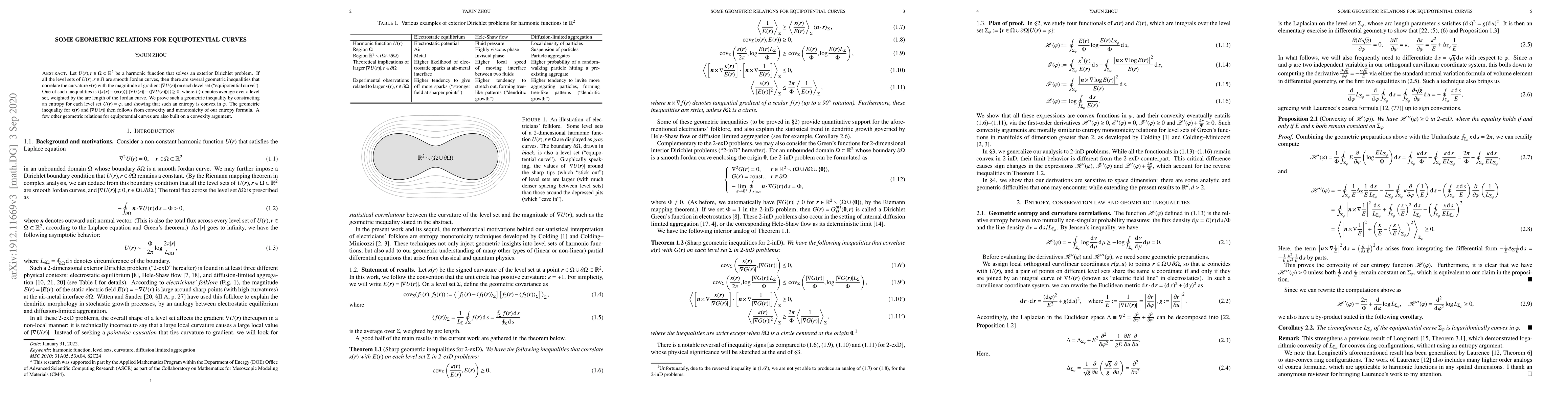 Let $U(\boldsymbol r),\boldsymbol r\in\Omega\subset \mathbb R^2$ be a harmonic function that solves an exterior Dirichlet problem. If all the level sets of $U(\boldsymbol r),\boldsymbol r\in\Omega$ are smooth Jordan curves, then there are several geometric inequalities that correlate the curvature $\kappa(\boldsymbol r) $ with the magnitude of gradient $ |\nabla U(\boldsymbol r)|$ on each level set ("equipotential curve"). One of such inequalities is $ \langle [\kappa(\boldsymbol r)-\langle\kappa(\boldsymbol r)\rangle][|\nabla U(\boldsymbol r)|-\langle |\nabla U(\boldsymbol r)|\rangle]\rangle\geq0$, where $ \langle \cdot\rangle$ denotes average over a level set, weighted by the arc length of the Jordan curve. We prove such a geometric inequality by constructing an entropy for each level set $U(\boldsymbol r)=\varphi $, and showing that such an entropy is convex in $\varphi$. The geometric inequality for $\kappa(\boldsymbol r) $ and $ |\nabla U(\boldsymbol r)|$ then follows from the convexity and monotonicity of our entropy formula. A few other geometric relations for equipotential curves are also built on a convexity argument.
