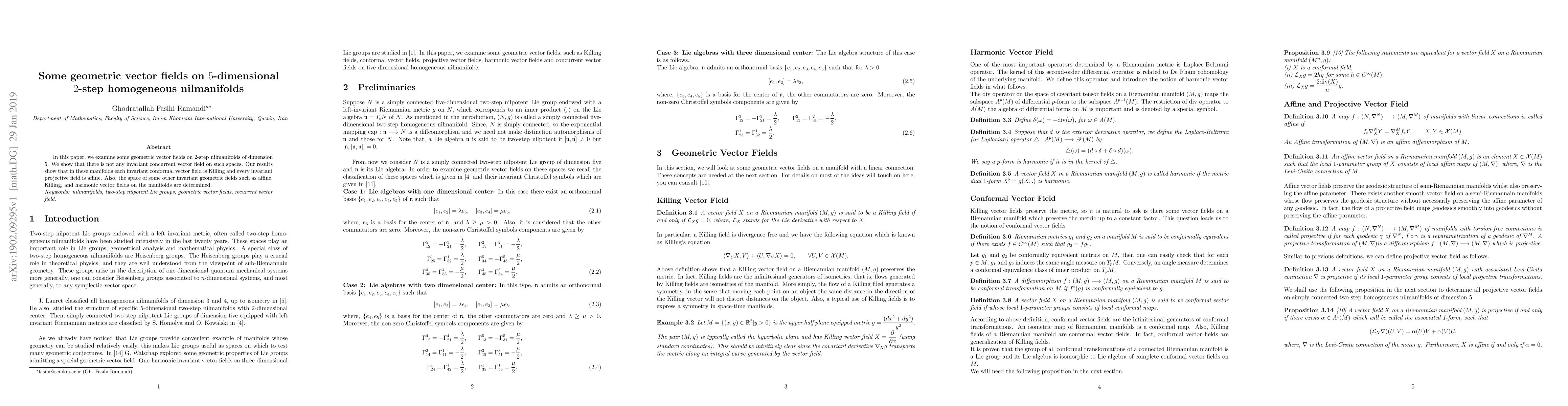 Summary: This research investigates specific geometric vector fields on 5-dimensional 2-step homogeneous nilmanifolds, focusing on their structural properties and implications. The study contributes to the understanding of the underlying geometry and topology of such nilmanifolds.