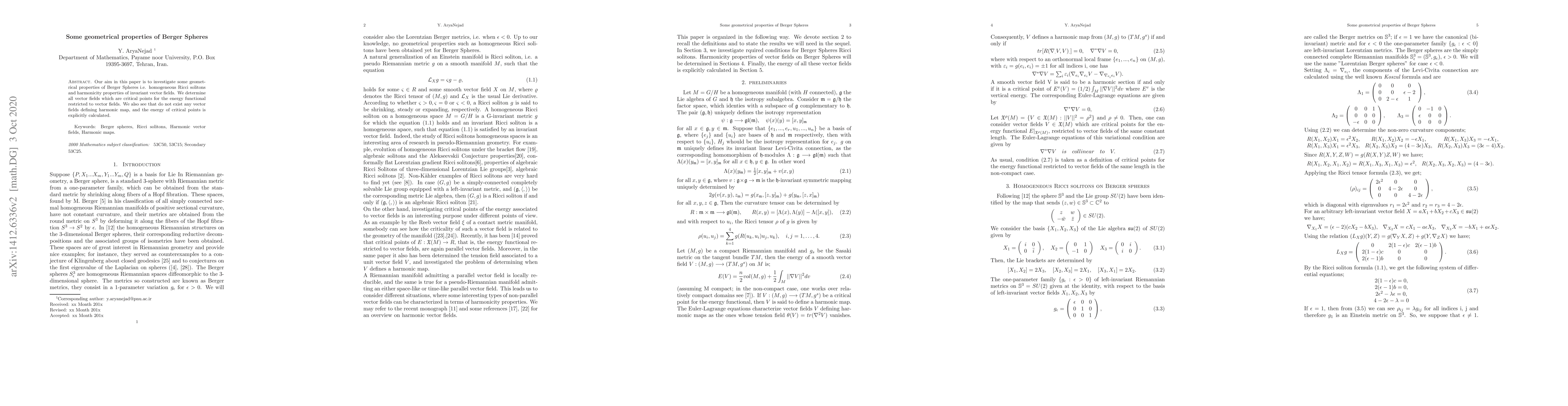 This paper explores geometrical properties of Berger Spheres, specifically homogeneous Ricci solitons, focusing on harmonicity of invariant vector fields. It identifies all critical points for the energy functional and concludes that no vector fields define harmonic maps, while explicitly calculating the energy of these critical points.