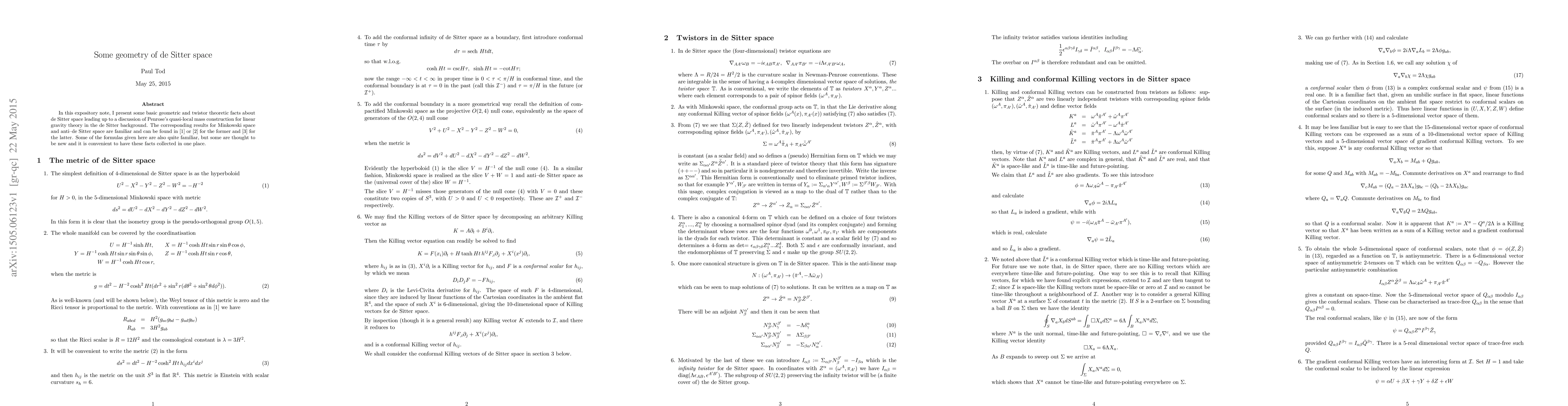 This paper presents geometric facts about de Sitter space, a spacetime model used in linear gravity theory, and collects familiar formulas for comparison with other spacetimes.