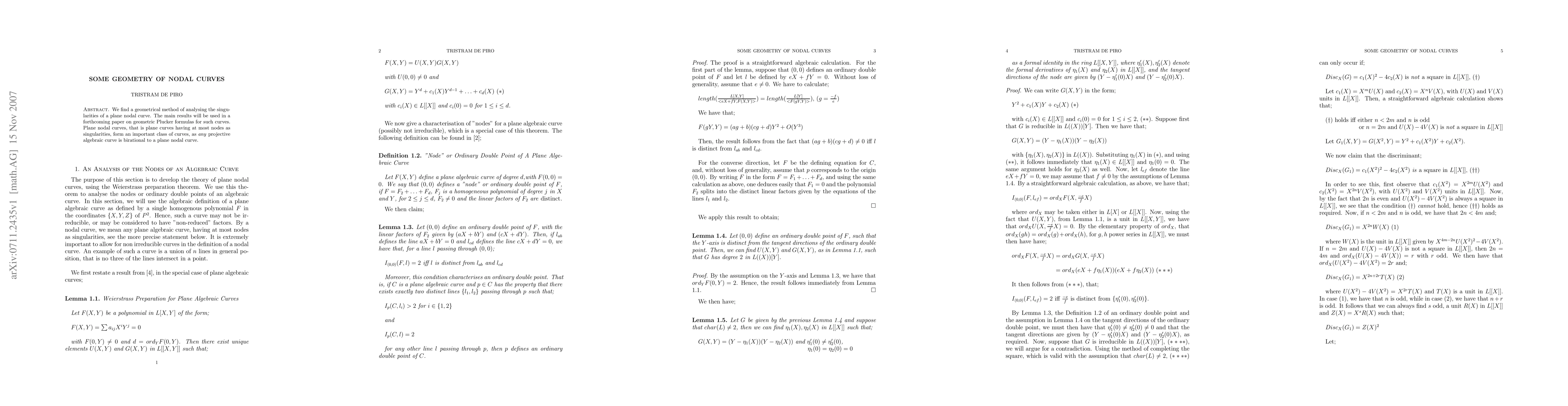 This paper presents a geometrical approach to analyzing the singularities of plane nodal curves, focusing on their nodes. The findings will support future work on geometric Plücker formulas for these curves, which are significant as any projective algebraic curve can be birationally related to a plane nodal curve.
