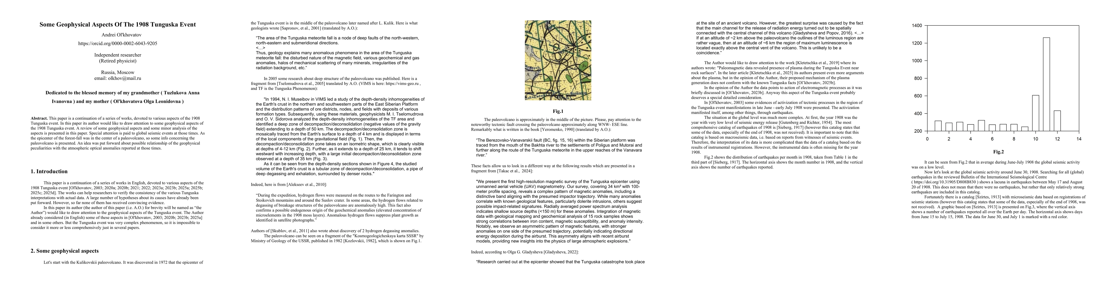 This paper is a continuation of a series of works, devoted to various aspects of the 1908 Tunguska event. In this paper its author would like to draw attention to some geophysical aspects of the 1908 Tunguska event. A review of some geophysical aspects and some minor analysis of the aspects is presented in this paper. Special attention is paid to global seismic events at those times. As the epicenter of the forest-fall was in the center of a paleovolcano, so some info concerning the paleovolcano is presented. An idea was put forward about possible relationship of the geophysical peculiarities with the atmospheric optical anomalies reported at those times.