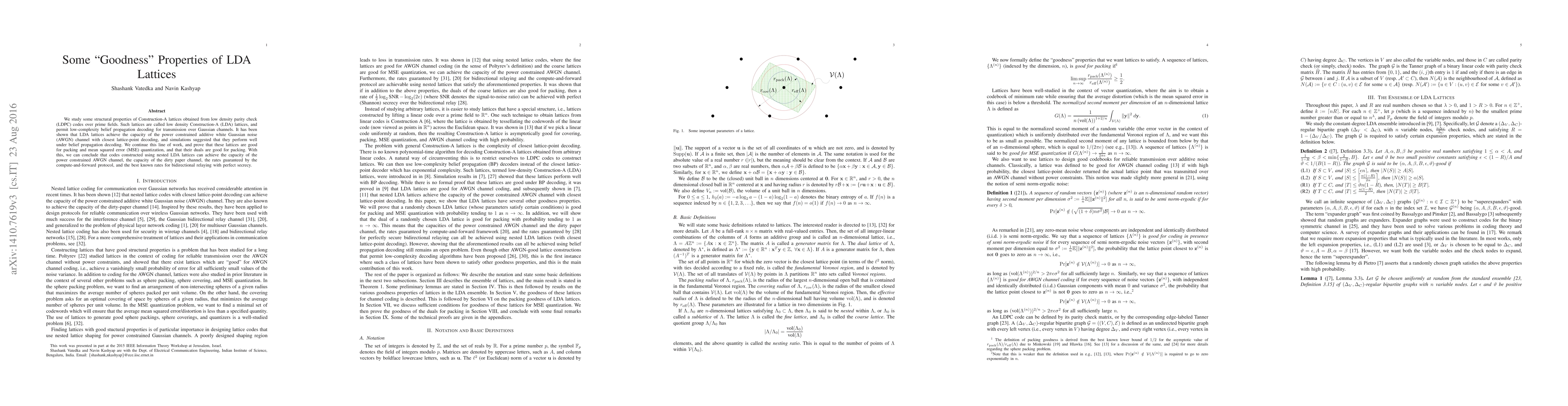 We study some structural properties of Construction-A lattices obtained from low density parity check (LDPC) codes over prime fields. Such lattices are called low density Construction-A (LDA) lattices, and permit low-complexity belief propagation decoding for transmission over Gaussian channels. It has been shown that LDA lattices achieve the capacity of the power constrained additive white Gaussian noise (AWGN) channel with closest lattice-point decoding, and simulations suggested that they perform well under belief propagation decoding. We continue this line of work, and prove that these lattices are good for packing and mean squared error (MSE) quantization, and that their duals are good for packing. With this, we can conclude that codes constructed using nested LDA lattices can achieve the capacity of the power constrained AWGN channel, the capacity of the dirty paper channel, the rates guaranteed by the compute-and-forward protocol, and the best known rates for bidirectional relaying with perfect secrecy.