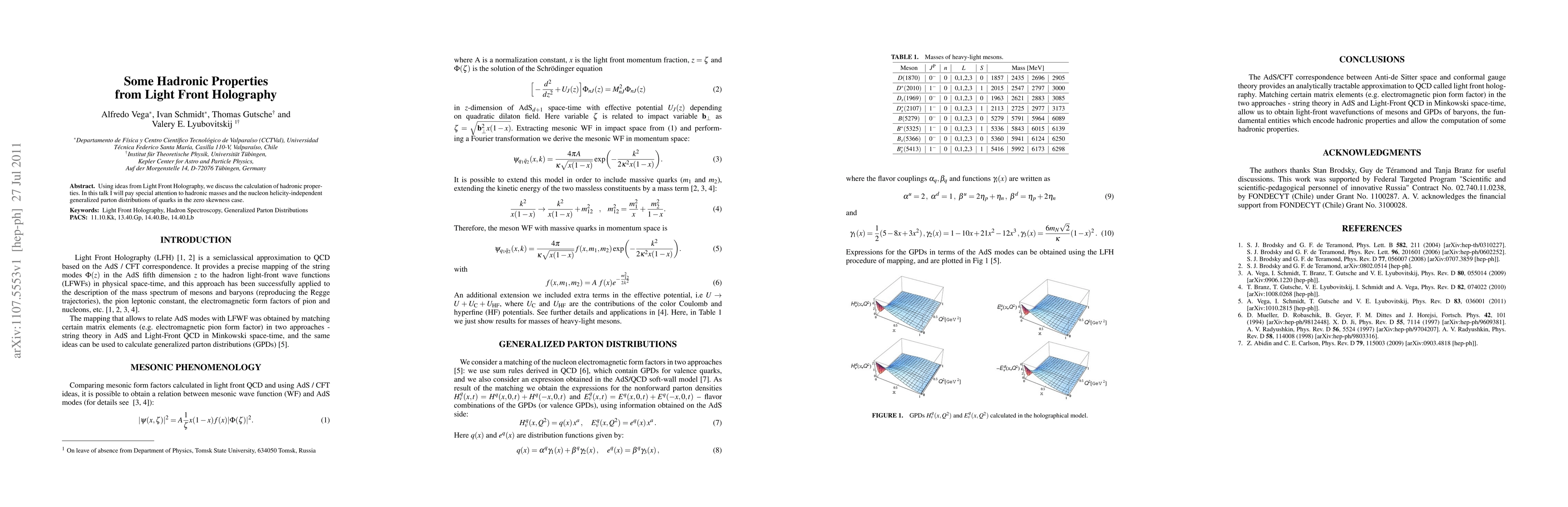 Summary: This paper explores hadronic properties through Light Front Holography, focusing on calculating masses and nucleon helicity-independent generalized parton distributions, particularly in the zero skewness scenario.