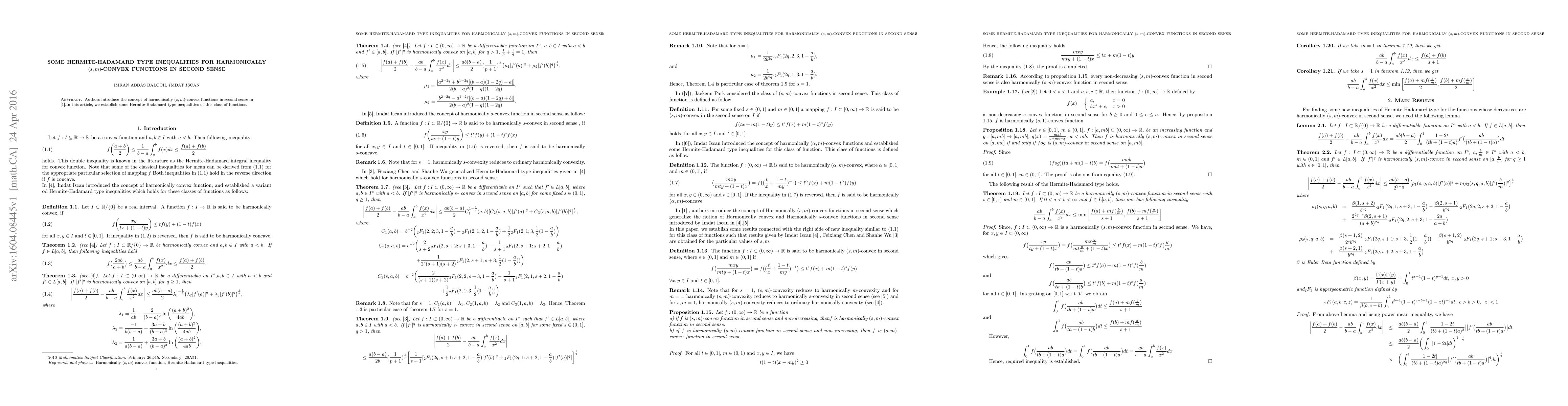 This paper introduces harmonically $(s,m)$-convex functions in the second sense and establishes Hermite-Hadamard type inequalities for these functions, extending classical convexity concepts. The derived inequalities provide new mathematical bounds for these specific convexity classes.