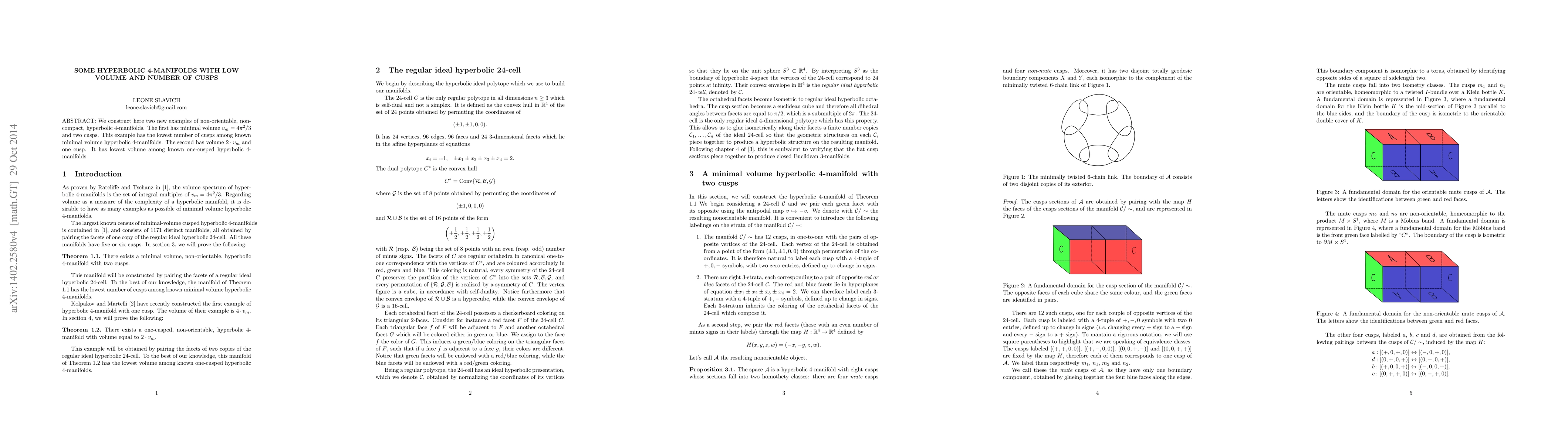This paper constructs two new hyperbolic 4-manifolds: one with minimal volume and two cusps, the lowest number of cusps for such volume; the other with twice the minimal volume and just one cusp, the lowest volume for a one-cusped hyperbolic 4-manifold.