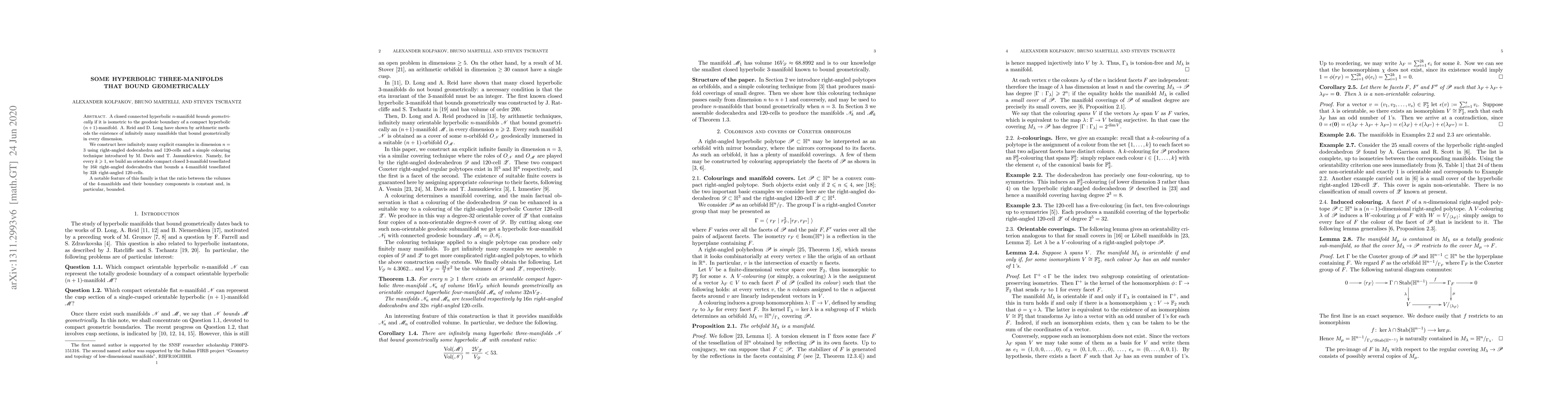 A closed connected hyperbolic $n$-manifold bounds geometrically if it is isometric to the geodesic boundary of a compact hyperbolic $(n+1)$-manifold. A. Reid and D. Long have shown by arithmetic methods the existence of infinitely many manifolds that bound geometrically in every dimension. We construct here infinitely many explicit examples in dimension $n=3$ using right-angled dodecahedra and $120$-cells and a simple colouring technique introduced by M. Davis and T. Januszkiewicz. Namely, for every $k\geqslant 1$, we build an orientable compact closed $3$-manifold tessellated by $16k$ right-angled dodecahedra that bounds a $4$-manifold tessellated by $32k$ right-angled $120$-cells. A notable feature of this family is that the ratio between the volumes of the $4$-manifolds and their boundary components is constant and, in particular, bounded.