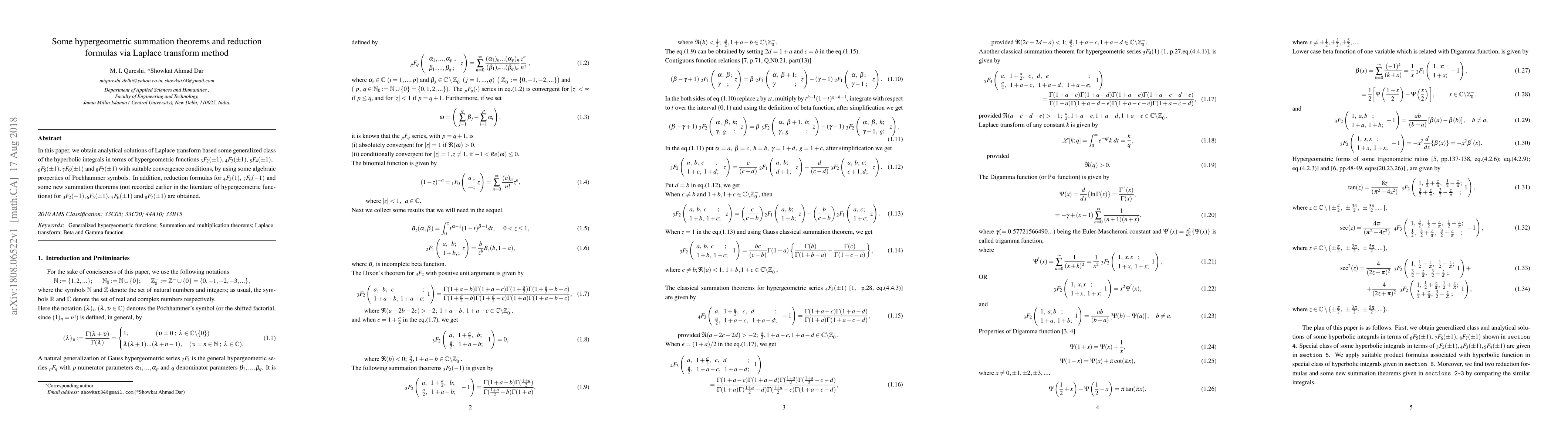 In this paper, we obtain analytical solutions of Laplace transform based some generalized class of the hyperbolic integrals in terms of hypergeometric functions ${}_3F_2 (\pm1)$, ${}_4F_3 (\pm1)$, ${}_5F_4(\pm1)$, ${}_6F_5(\pm1)$, ${}_7F_6(\pm1)$ and ${}_8F_7(\pm1)$ with suitable convergence conditions, by using some algebraic properties of Pochhammer symbols. In addition, reduction formulas for ${}_4F_3(1)$, ${}_7F_6(-1)$ and some new summation theorems (not recorded earlier in the literature of hypergeometric functions) for ${}_3F_2(-1)$, ${}_6F_5(\pm1)$, ${}_7F_6(\pm1)$ and ${}_8F_7(\pm1)$ are obtained.