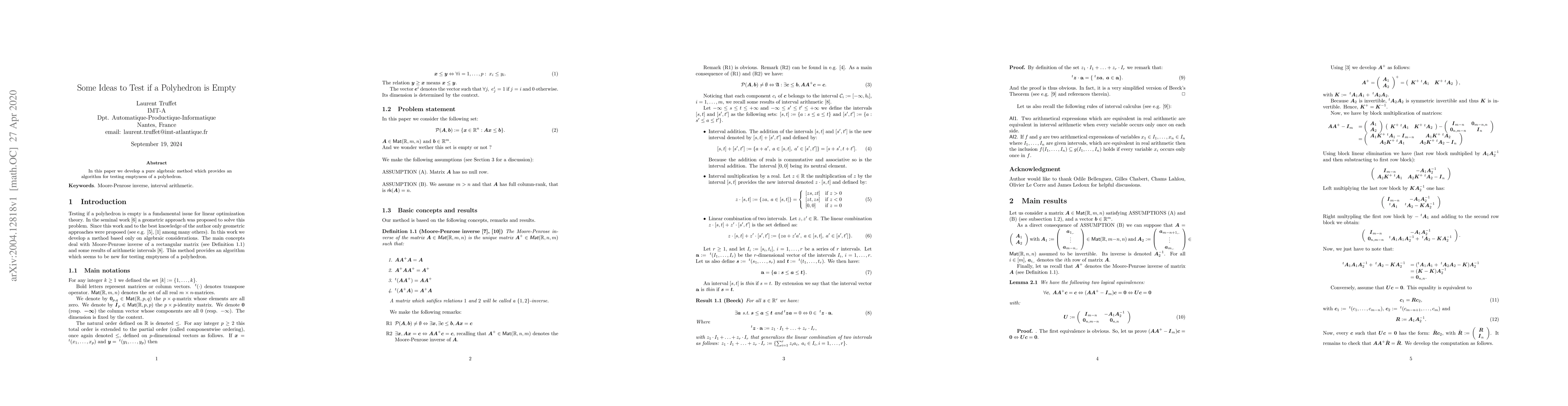In this paper we develop a pure algebraic method which provides an algorithm for testing emptyness of a polyhedron.