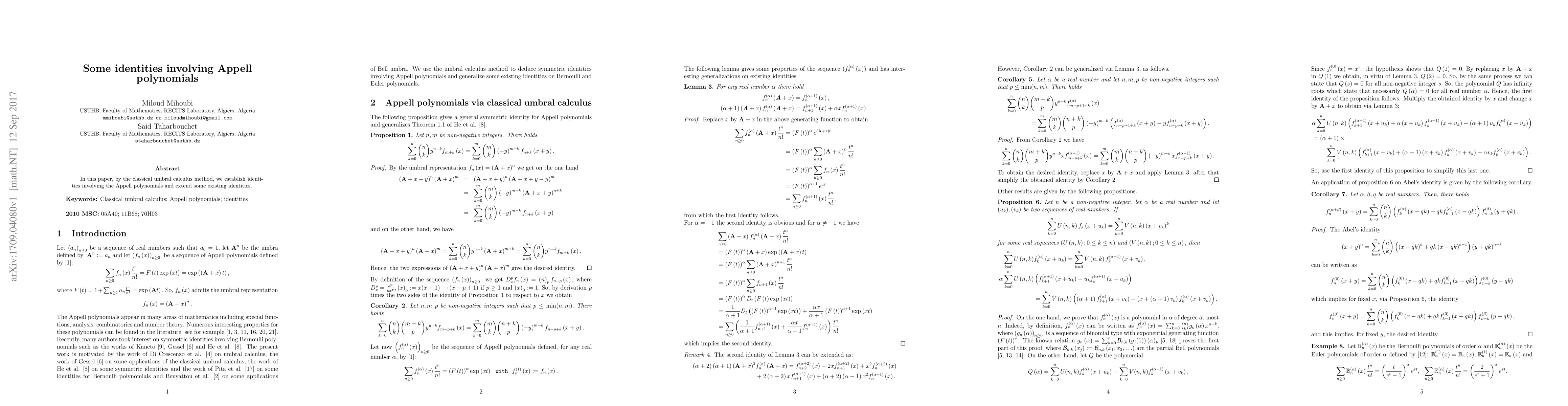 In this papier, by the classical umbral calculus method, we establish identities involving the Appell polynomials and extend some existing identities.