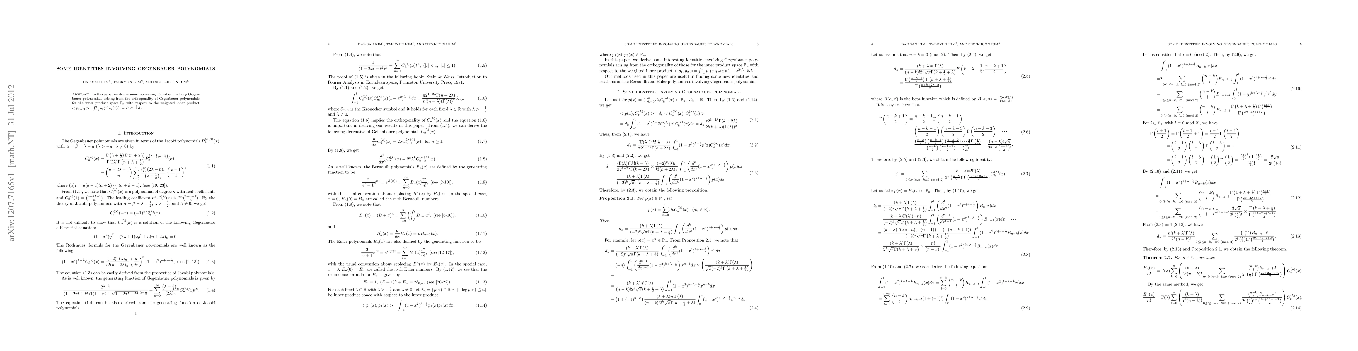 Summary: This paper explores and derives novel identities stemming from the orthogonality properties of Gegenbauer polynomials, contributing to the understanding of their mathematical relationships.