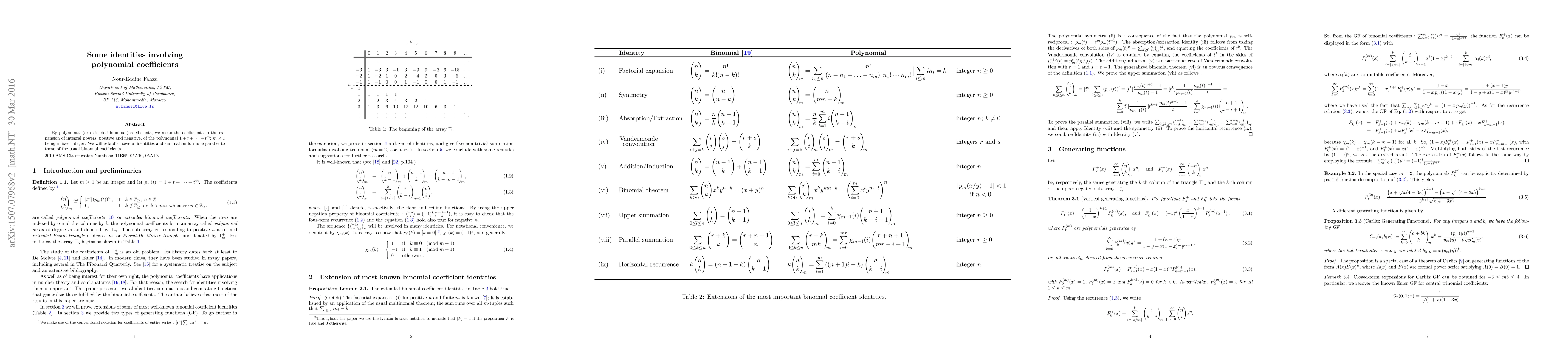 By polynomial (or extended binomial) coefficients, we mean the coefficients in the expansion of integral powers, positive and negative, of the polynomial $1+t +\cdots +t^{m}$; $m\geq 1$ being a fixed integer. We will establish several identities and summation formul\ae\ parallel to those of the usual binomial coefficients.