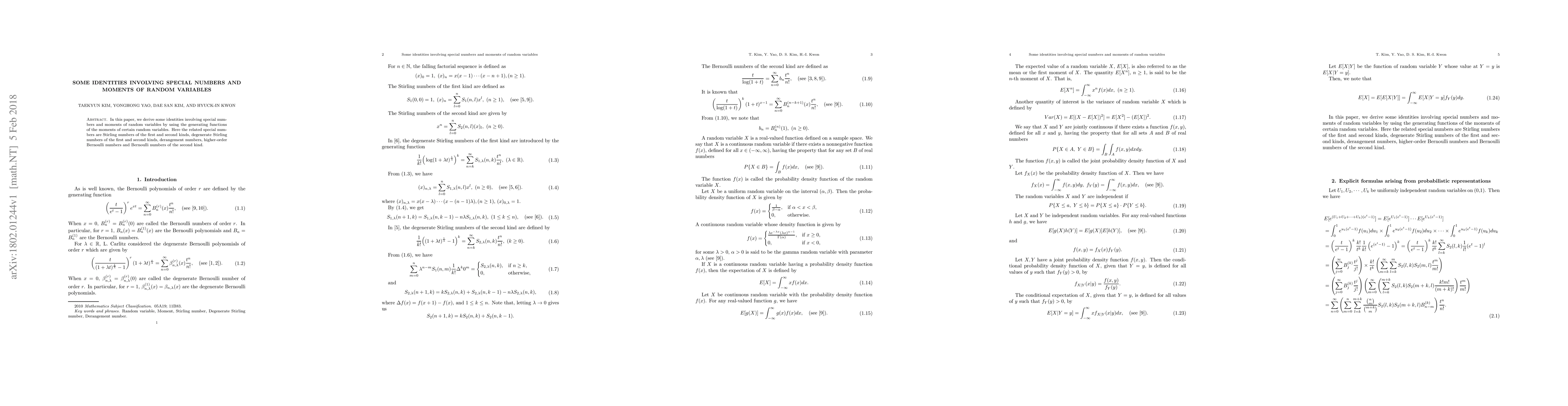 This paper establishes new identities linking special numbers such as Stirling, degenerate Stirling, and Bernoulli numbers with moments of random variables, utilizing generating functions for the derivation.