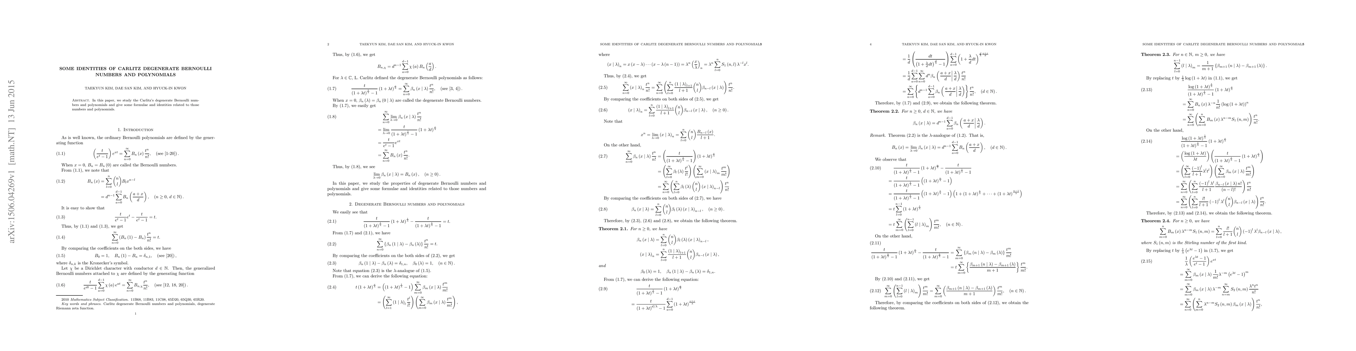 The paper studies Carlitz's degenerate Bernoulli numbers and polynomials, deriving various formulae and identities related to them using generating functions and Stirling numbers.