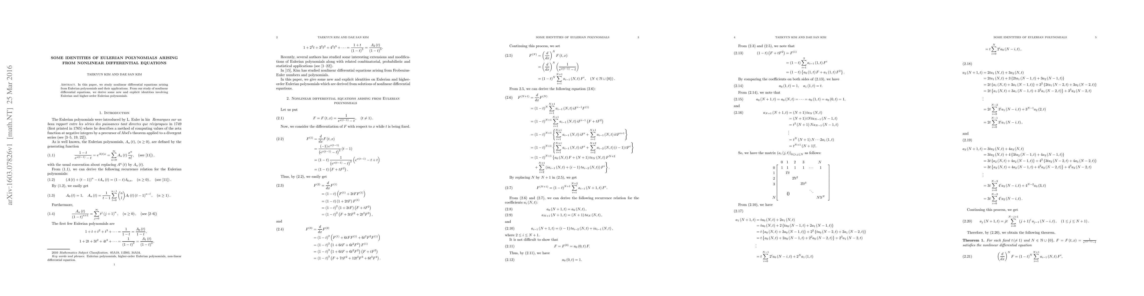 This paper investigates nonlinear differential equations linked to Eulerian polynomials, deriving new explicit identities for these polynomials and higher-order variants. The findings extend the understanding of Eulerian polynomials through their differential equation connections.