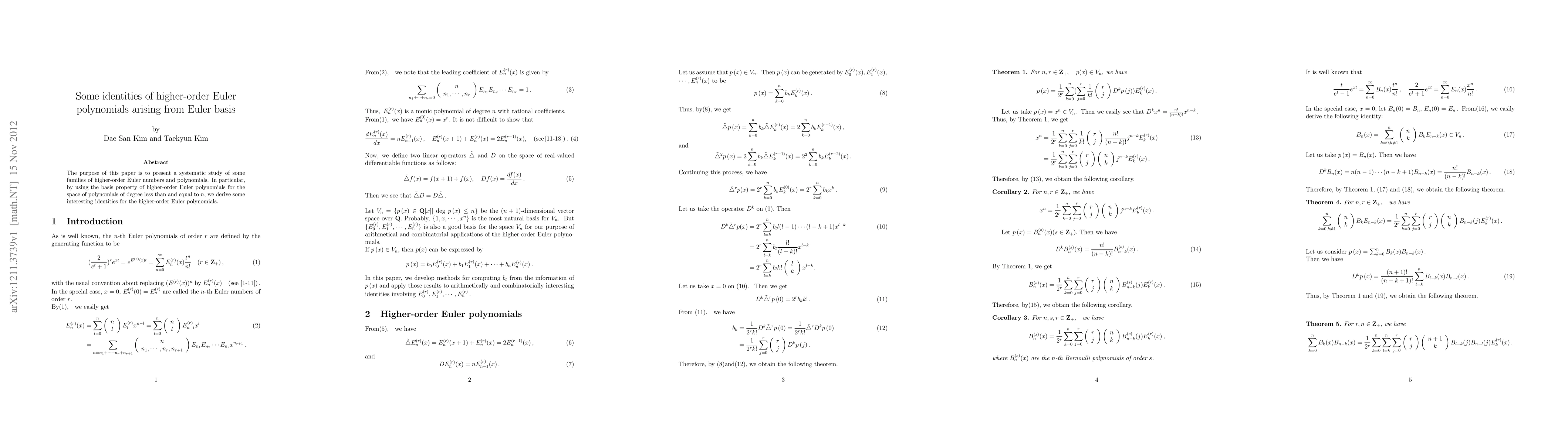 This paper systematically explores families of higher-order Euler numbers and polynomials, deriving new identities through the basis property of higher-order Euler polynomials for polynomials of degree ≤ n. The study reveals intriguing relationships within these mathematical constructs.