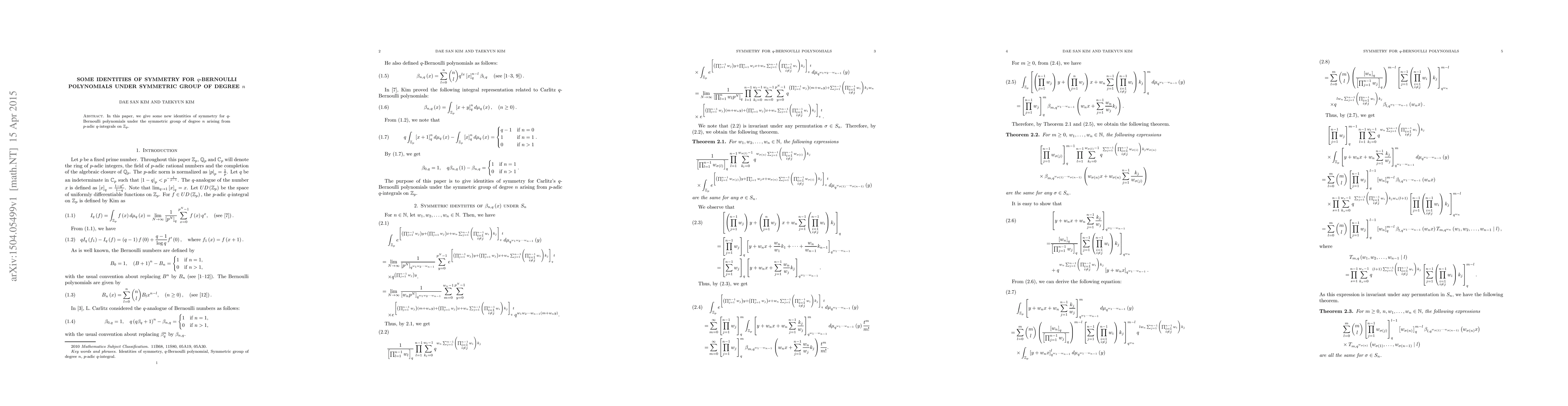Summary: This paper presents novel symmetry identities for q-Bernoulli polynomials linked to the symmetric group of degree n, derived from p-adic q-integrals on Zp. These findings enhance the understanding of q-Bernoulli polynomials' structural properties.