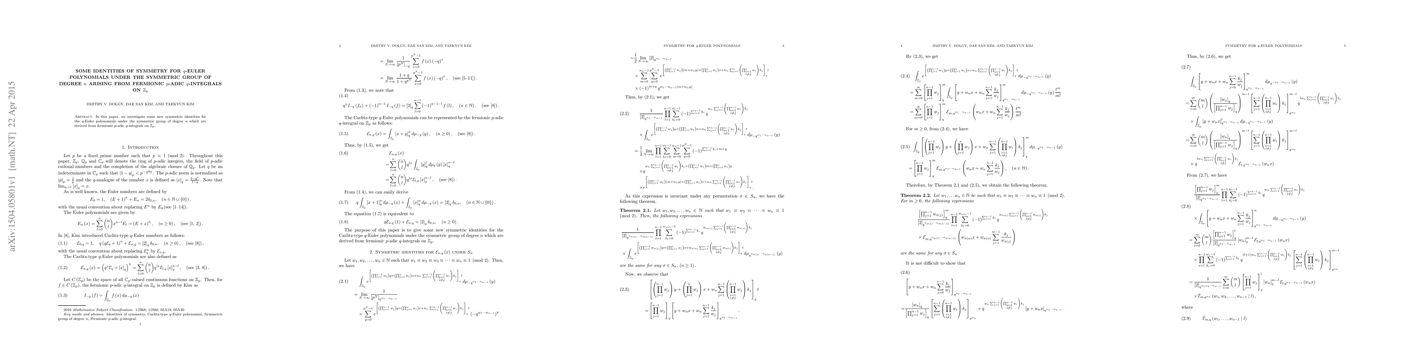 This paper explores novel symmetric identities for q-Euler polynomials under the symmetric group of degree n, derived from fermionic p-adic q-integrals on Zp. The identities reveal deeper connections between algebraic structures and integral theory.