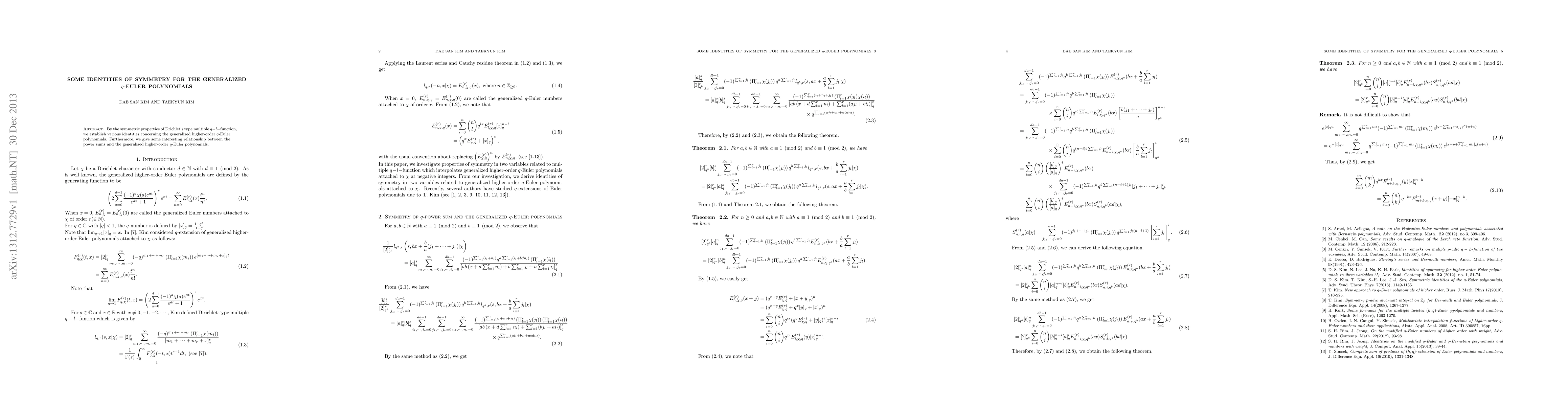 By the symmetric properties of Drichlet's type multiple q-l-function, we establish various identities concerning the generalized higher-order q-Euler polynomials. Furthermore, we give some interesting relationship between the power sums and the generalized higher-order $q$-Euler polynomials.