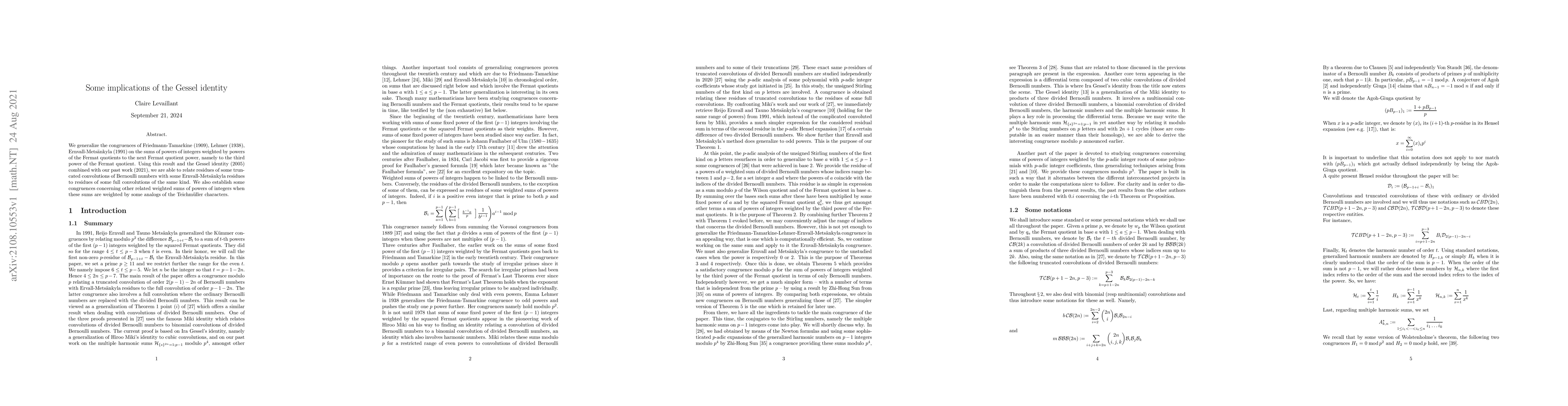 We generalize the congruences of Friedmann-Tamarkine (1909), Lehmer (1938), Ernvall-Metsankyla (1991) on the sums of powers of integers weighted by powers of the Fermat quotients to the next Fermat quotient power, namely to the third power of the Fermat quotient. Using this result and the Gessel identity (2005) combined with our past work (2001), we are able to relate residues of some truncated convolutions of Bernoulli numbers with some Ernvall-Metsankyla residues to some full convolutions of the same kind. We also establish some congruences concerning other related weighed sums of powers of integers when these sums are weighted by some analogs of the Teichmuller characters.