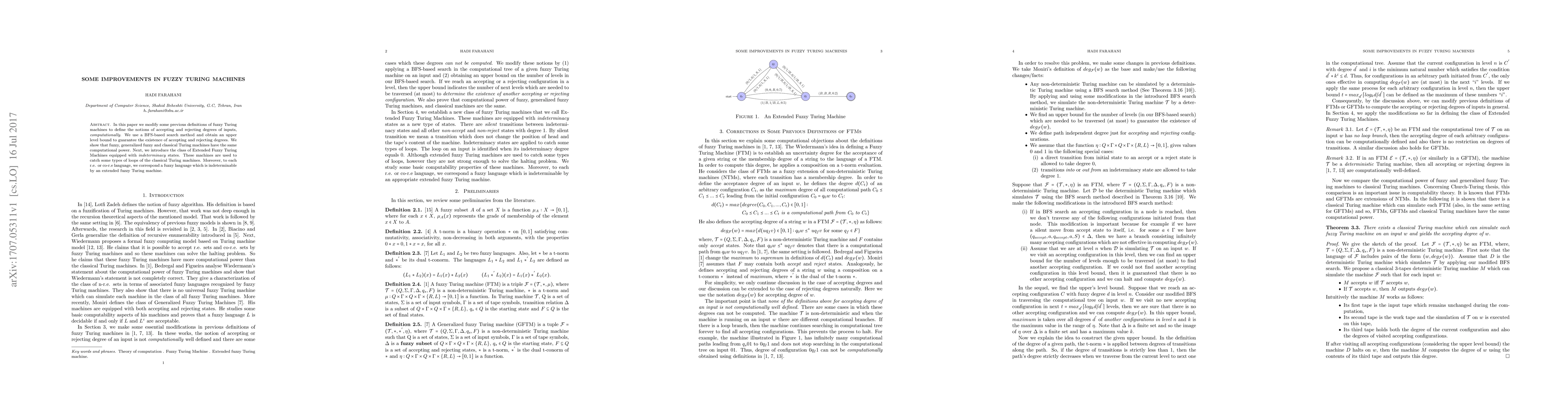 In this paper, we modify some previous definitions of fuzzy Turing machines to define the notions of accepting and rejecting degrees of inputs, computationally. We use a BFS-based search method and obtain an upper level bound to guarantee the existence of accepting and rejecting degrees. We show that fuzzy, generalized fuzzy and classical Turing machines have the same computational power. Next, we introduce the class of Extended Fuzzy Turing Machines equipped with indeterminacy states. These machines are used to catch some types of loops of the classical Turing machines. Moreover, to each r.e. or co-r.e language, we correspond a fuzzy language which is indeterminable by an extended fuzzy Turing machine.