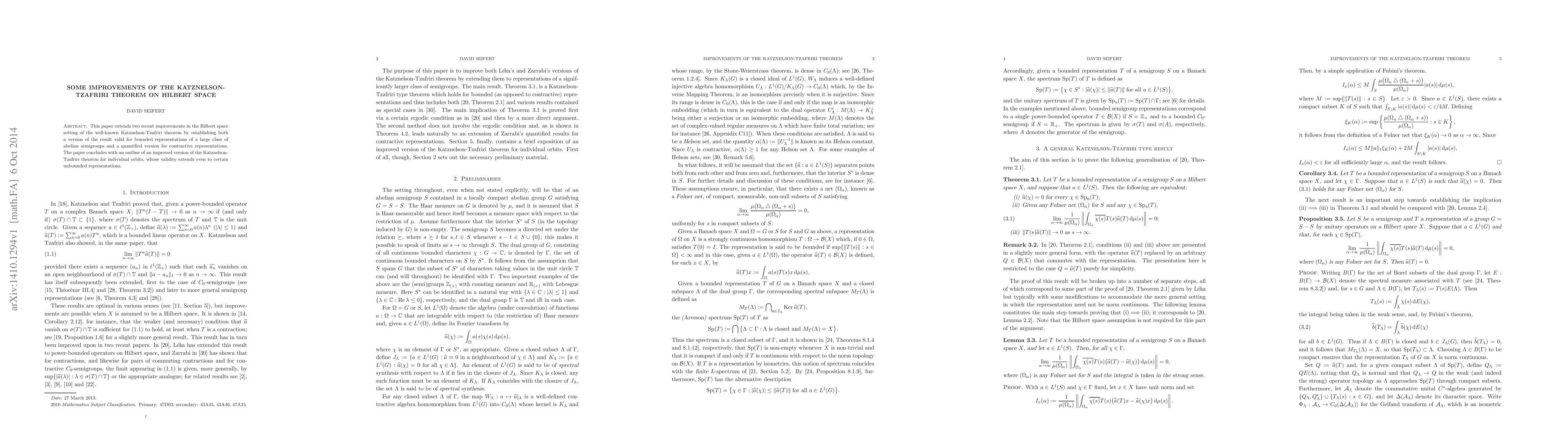 This paper extends the Katznelson-Tzafriri theorem in Hilbert space by establishing results for bounded representations of abelian semigroups and a quantified version for contractive representations. It also outlines an improved version for individual orbits, extending to certain unbounded representations.