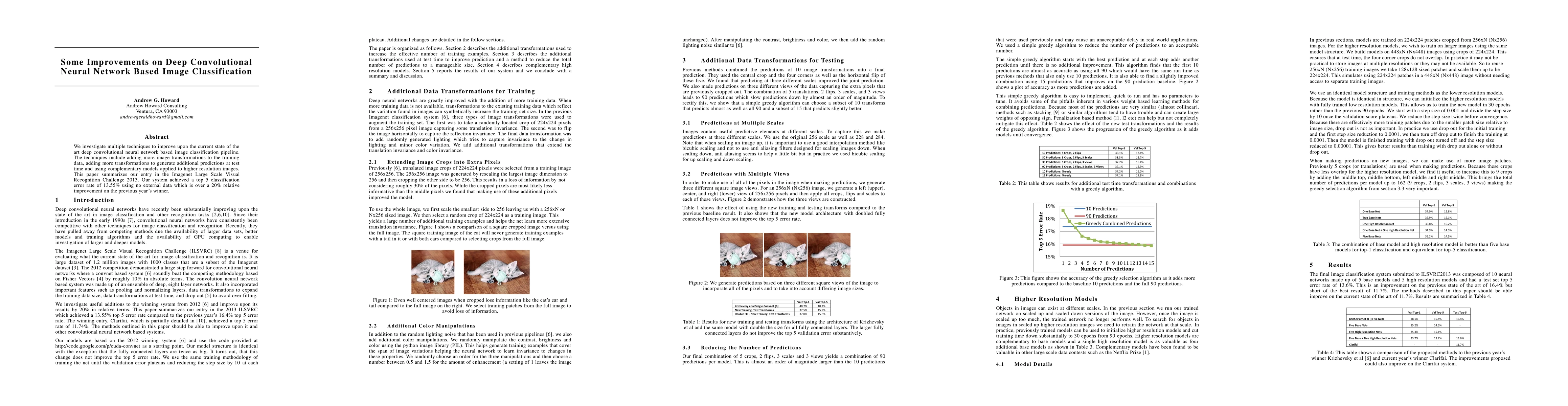 This paper proposes enhancements to deep convolutional neural networks for image classification, including augmented training data, test-time transformations, and complementary higher-resolution models. The approach led to a 13.55% top 5 error rate in the 2013 ImageNet competition, surpassing the previous year's winner by over 20%.