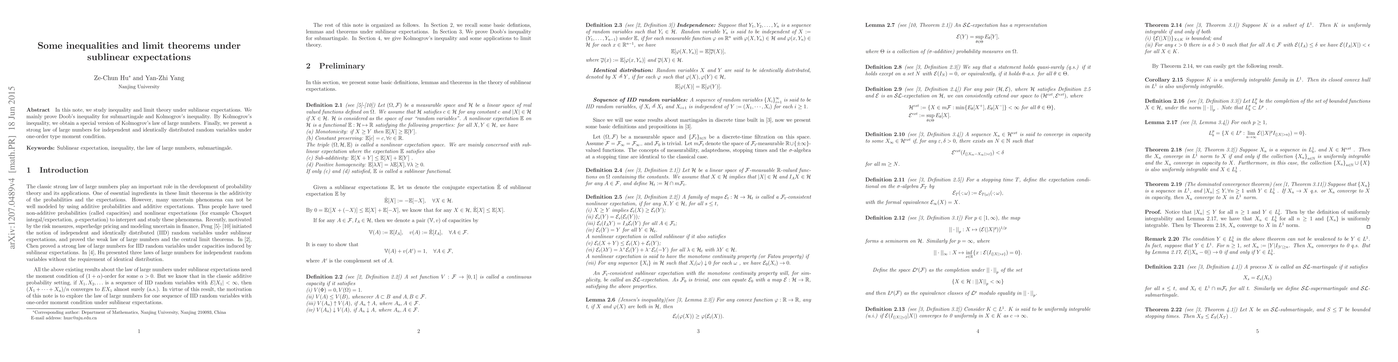 This paper investigates inequalities and limit theorems under sublinear expectations, proving Doob's and Kolmogorov's inequalities, and deriving a special version of Kolmogorov's law of large numbers and a strong law of large numbers under a one-order moment condition.