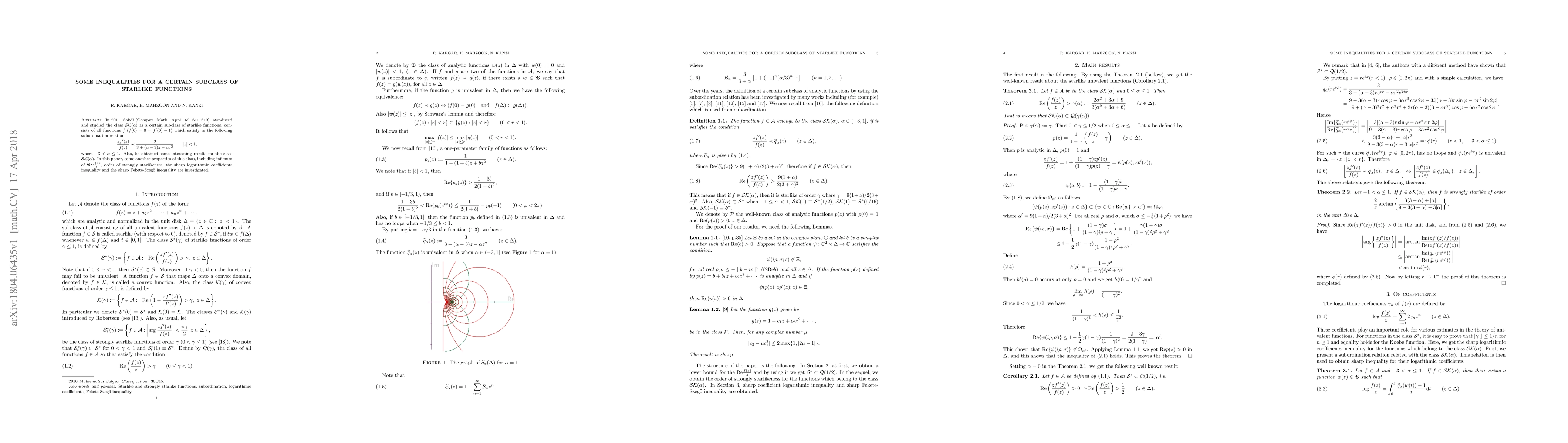 This paper explores properties of a specific subclass of starlike functions, (mathcal{SK}(alpha)), introduced by Sok'{o}{l} in 2011. It investigates the infimum of (mathfrak{Re}rac{f(z)}{z}), order of strongly starlikeness, sharp logarithmic coefficients inequality, and sharp Fekete-Szeg"{o} inequality for this class.