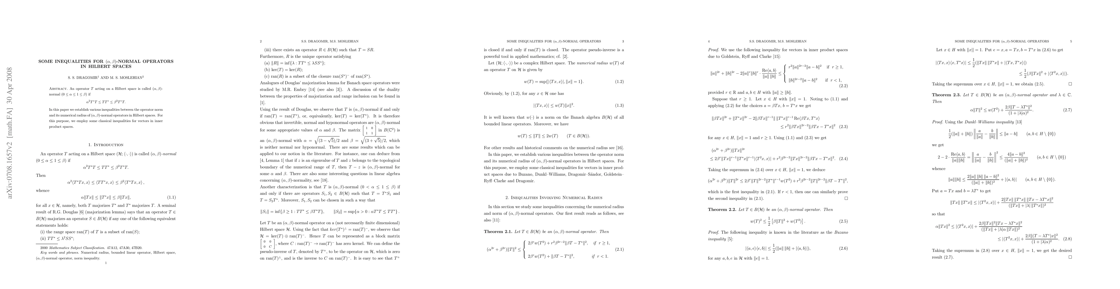 This paper investigates $(\alpha, \beta)$-normal operators in Hilbert spaces, establishing inequalities between their operator norm and numerical radius. Classical inequalities for vectors in inner product spaces are utilized to achieve these results.
