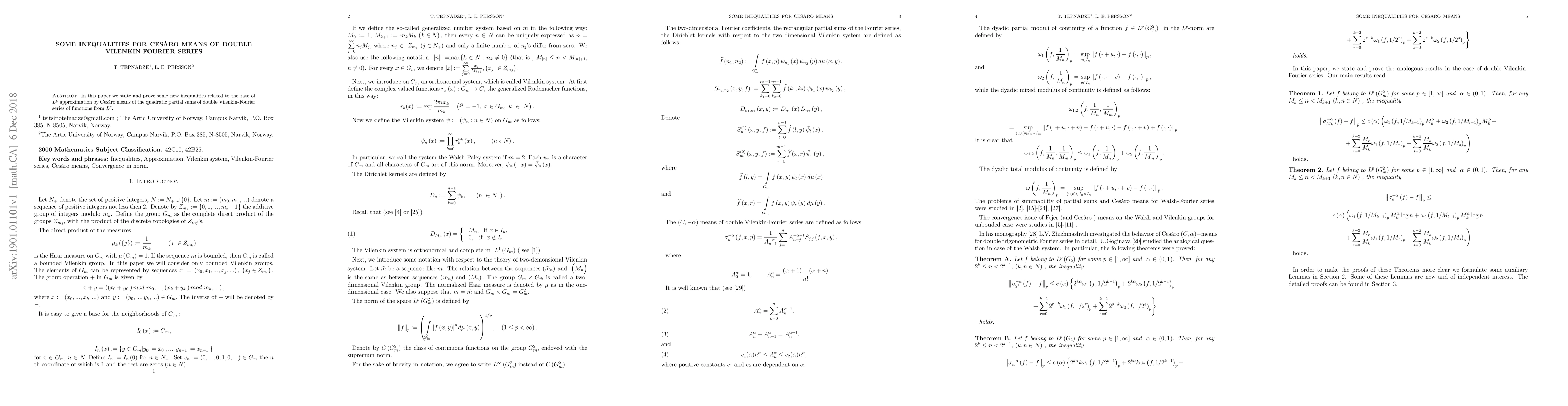 Summary: This paper introduces and proves new inequalities concerning the $L^{p}$ approximation rate of Cesàro means derived from the quadratic partial sums of double Vilenkin-Fourier series for functions in $L^{p}$. The study enhances the understanding of approximation techniques in function spaces.