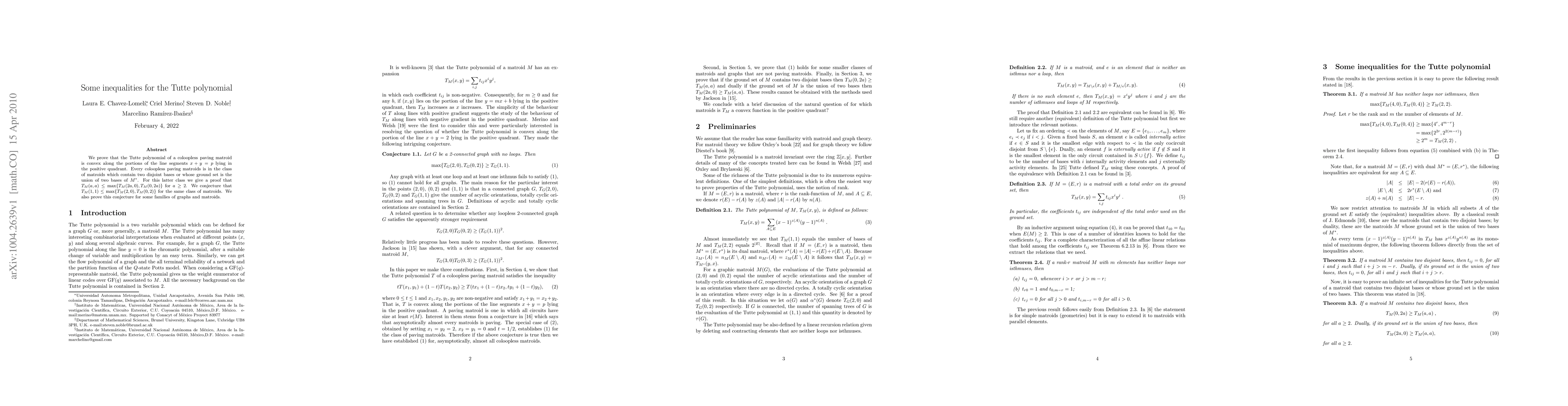 We prove that the Tutte polynomial of a coloopless paving matroid is convex along the portions of the line segments x+y=p lying in the positive quadrant. Every coloopless paving matroids is in the class of matroids which contain two disjoint bases or whose ground set is the union of two bases of M*. For this latter class we give a proof that T_M(a,a) <= max {T_M(2a,0), T_M(0,2a)} for a >= 2. We conjecture that T_M(1,1) <= max {T_M(2,0), T_M(0,2)} for the same class of matroids. We also prove this conjecture for some families of graphs and matroids.