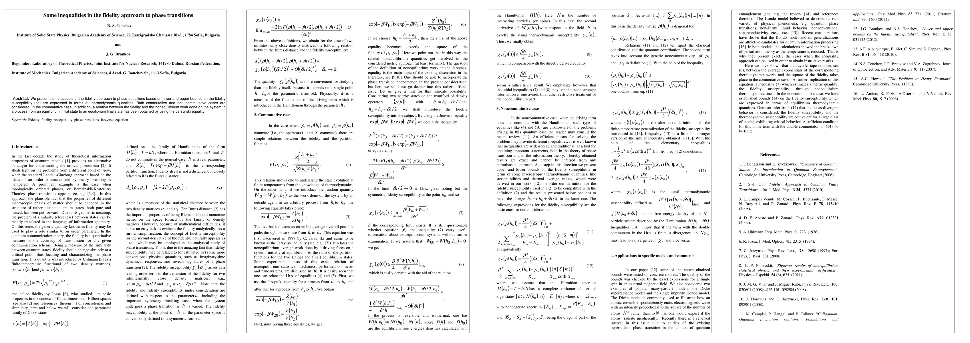 We present some aspects of the fidelity approach to phase transitions based on lower and upper bounds on the fidelity susceptibility that are expressed in terms of thermodynamic quantities. Both commutative and non commutative cases are considered. In the commutative case, in addition, a relation between the fidelity and the nonequilibrium work done on the system in a process from an equilibrium initial state to an equilibrium final state has been obtained by using the Jarzynski equality.