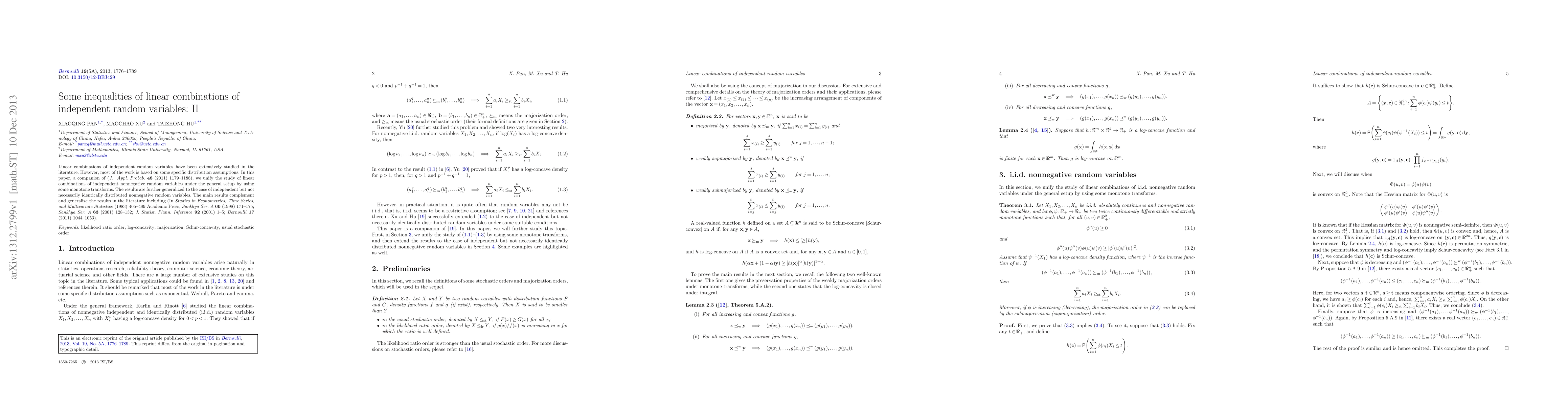 This paper generalizes the study of linear combinations of independent nonnegative random variables without specific distribution assumptions, using monotone transforms. It extends previous results to independent but not necessarily identically distributed variables, thereby complementing and broadening existing literature.